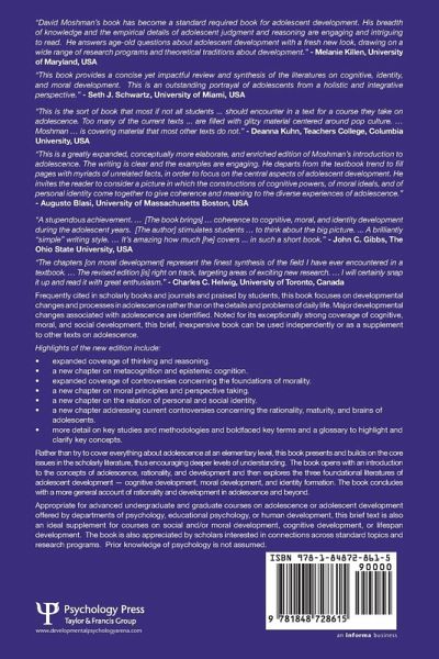 Frequently cited in scholarly books and journals and praised by students, this book focuses on developmental changes and processes in adolescence rather than on the details and problems of daily life. Major developmental changes associated with adolescence are identified. Noted for its exceptionally strong coverage of cognitive, moral, and social development, this brief, inexpensive book can be used independently or as a supplement to other texts on adolescence. Highlights of the new edition include: expanded coverage of thinking and reasoning. a new chapter on metacognition and epistemic cognition. expanded coverage of controversies concerning the foundations of morality. a new chapter on moral principles and perspective taking. a new chapter on the relation of personal and social identity. a new chapter addressing current controversies concerning the rationality, maturity, and brains of adolescents. more detail on key studies and methodologies and boldfaced key terms and a glossary to highlight and clarify key concepts. Rather than try to cover everything about adolescence at an elementary level, this book presents and builds on the core issues in the scholarly literature, thus encouraging deeper levels of understanding. The book opens with an introduction to the concepts of adolescence, rationality, and development and then explores the three foundational literatures of adolescent development - cognitive development, moral development, and identity formation. The book concludes with a more general account of rationality and development in adolescence and beyond. Appropriate for advanced undergraduate and graduate courses on adolescence or adolescent development offered by departments of psychology, educational psychology, or human development, this brief text is also an ideal supplement for courses on social and/or moral development, cognitive development, or lifespan development. The book is also appreciated by scholars interested in connections across standard topics and research programs. Prior knowledge of psychology is not assumed.