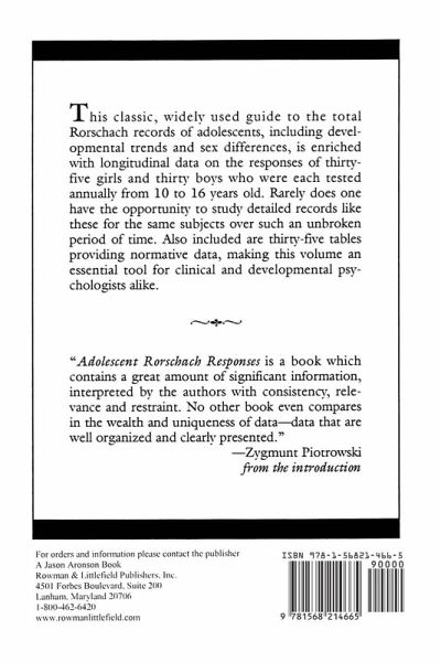 This guide to the Rorscharch records of adolescents, including developmental trends and sex differences, has been enriched with longitudinal data on the responses of 35 girls and 30 boys who were each tested annually from 10 to 16 years old.
