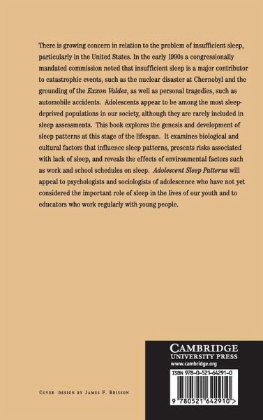 There is a growing concern in relation to the problem of insufficient sleep, particularly in the United States. In the early 1990s a Congressionally mandated commission noted that insufficient sleep is a major contributor to catastrophic events, such as Chernobyl and the Exxon Valdez, as well as personal tragedies, such as automobile accidents. Adolescents appear to be among the most sleep-deprived populations in our society, though they are rarely included in sleep assessments. This book explores the genesis and development of sleep patterns in adolescents. It examines biological and cultural factors that influence sleep patterns, presents risks associated with lack of sleep, and reveals the effects of environmental factors such as work and school schedules on sleep. Adolescent Sleep Patterns will appeal to psychologists and sociologists of adolescence who have not yet considered the important role of sleep in the lives of our youth.