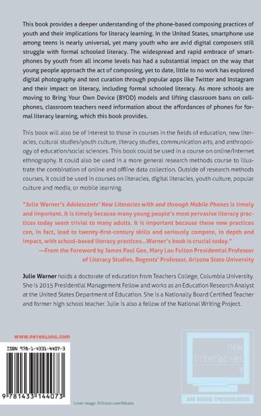 "Julie Warner's Adolescents' New Literacies with and through Mobile Phones is timely and important. It is timely because many young people's most pervasive literacy practices today seem trivial to many adults. It is important because these new practices can, in fact, lead to twenty-first-century skills and seriously compete, in depth and impact, with school-based literacy practices...Warner's book is crucial today." From the Foreword by James Paul Gee, Mary Lou Fulton Presidential Professor of Literacy Studies, Regents' Professor, Arizona State University