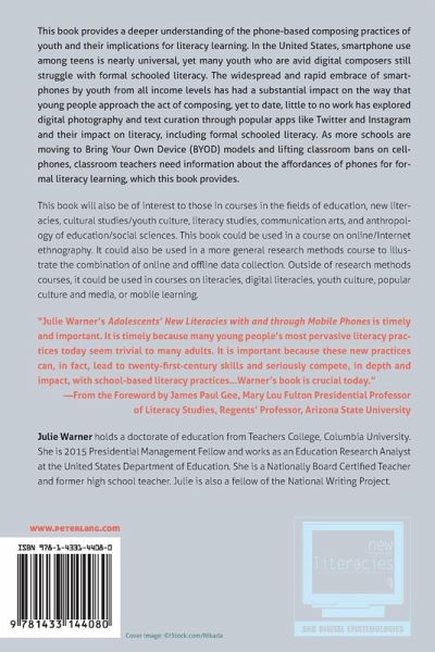 "Julie Warner's Adolescents' New Literacies with and through Mobile Phones is timely and important. It is timely because many young people's most pervasive literacy practices today seem trivial to many adults. It is important because these new practices can, in fact, lead to twenty-first-century skills and seriously compete, in depth and impact, with school-based literacy practices...Warner's book is crucial today." From the Foreword by James Paul Gee, Mary Lou Fulton Presidential Professor of Literacy Studies, Regents' Professor, Arizona State University