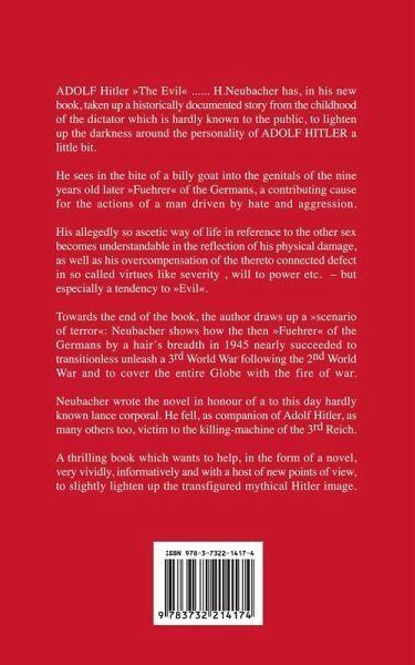 Neubacher makes to a subject of discussion the "Evil" in the former Fuehrer of the German people and moreover gives answers to up to this day unanswered Questions:- What consequences on Hitler s life did the bite of the "Billy Goat of Leonding" into the genitals of the then nine year old "Adi" have?- What influence did Hitler s "Youth Years in Vienna" have on his personal development towards becoming Germany s Fuehrer , as mankind knows him today?- Where does Hitler s unfathomable hatred and unrestrained will of destruction of Jews and everyone who didn t follow his opinion come from?- Why, how and under which circumstances did his so dearly loved niece "Geli" Raubal die?Into the scene of action, the author skillfully integrates a highly intelligent species on a "far distant Earth", which is observing the entire events on the Earth of the Humans with greatest of interest, without however intervening directly and yet the millions of light years distant observers of the terrible happenings about Adolf Hitler show us- what they look like and- what feats they are capable of, resulting from their overwhelming technology.As a kind of gift they also solve the age-old secret of the origin of life on our earth and tell us people where we come from.Towards the end of the book, the author draws up a "scenario of terror": H. Neubacher shows, how the then Fuehrer of the Germans nearly had managed by a hair s breadth and without transition, in the year 1943 to provoke a 3rd World War from the 2nd World war and to cover the entire Earth with the fire of war.This novel was written in honour of a nearly unknown soldier of the 3rd Reich. The insignificant lance corporal Eugen Wasner in 1943 told his comrades on the Eastern Front the story of "The bite of the Billy Goat of Leonding". He, Wasner, was present at the juvenile foul deed, when his school friend "Adi" urinated into the animal s mouth.The Chancellor and Warlord Hitler terribly punished Wasner for his spreading of this story from childhood days. But the revenge of the abused animal kept catching up with the mighty Fuehrer , like a poetic justice, again and again during his entire life.A thrilling book ,which in the form of a novel, follows the historic events between 1919 and 1945 very vividly and informatively with a large number of new points of view and up to now unknown facts, endeavoring to help shed some light on the transfigured and mystical "picture of Hitler".