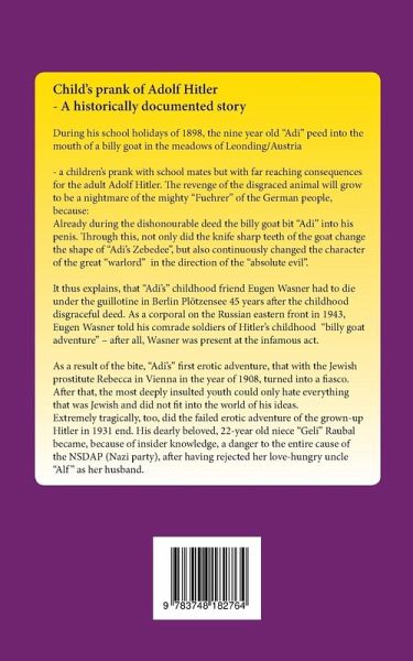 This novel was written in honour of a nearly unknown soldier of the 3rd Reich. The insignificant lance corporal Eugen Wasner in 1943 told his comrades on the Eastern Front the story of "The bite of the Billy Goat of Leonding". He, Wasner, was present at the juvenile foul deed, when his school friend "Adi" urinated into the animal's mouth.