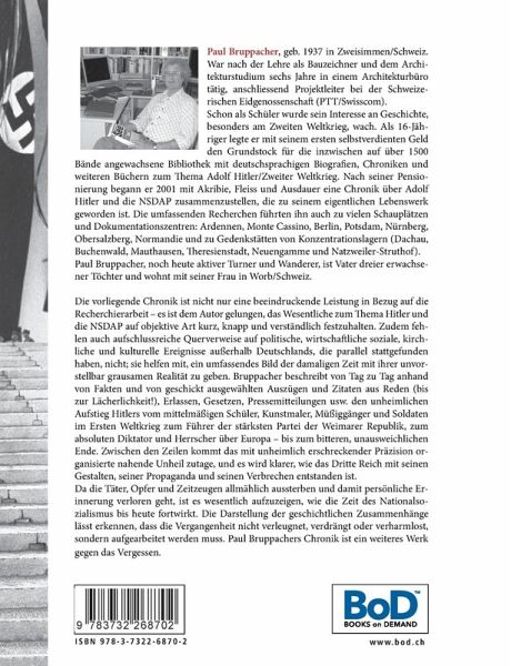 Die vorliegende Chronik ist nicht nur eine beeindruckende Leistung in Bezug auf die Recherchierarbeit - es ist dem Autor gelungen, das Wesentliche zum Thema Hitler und die NSDAP auf objektive Art kurz, knapp und verständlich festzuhalten. Zudem fehlen auch aufschlussreiche Querverweise auf politische, wirtschaftliche soziale, kirchliche und kulturelle Ereignisse außerhalb Deutschlands, die parallel stattgefunden haben, nicht; sie helfen mit, ein umfassendes Bild der damaligen Zeit mit ihrer unvorstellbar grausamen Realität zu geben. Bruppacher beschreibt von Tag zu Tag anhand von Fakten und von geschickt ausgewählten Auszügen und Zitaten aus Reden (bis zur Lächerlichkeit!), Erlassen, Gesetzen, Pressemitteilungen usw. den unheimlichen Aufstieg Hitlers vom mittelmäßigen Schüler, Kunstmaler, Müßiggänger und Soldaten im Ersten Weltkrieg zum Führer der stärksten Partei der Weimarer Republik, zum absoluten Diktator und Herrscher über Europa - bis zum bitteren, unausweichlichen Ende. Zwischen den Zeilen kommt das mit unheimlich erschreckender Präzision organisierte nahende Unheil zutage, und es wird klarer, wie das Dritte Reich mit seinen Gestalten, seiner Propaganda und seinen Verbrechen entstanden ist. Da die Täter, Opfer und Zeitzeugen allmählich aussterben und damit persönliche Erinnerung verloren geht, ist es wesentlich aufzuzeigen, wie die Zeit des Nationalsozialismus bis heute fortwirkt. Die Darstellung der geschichtlichen Zusammenhänge lässt erkennen, dass die Vergangenheit nicht verleugnet, verdrängt oder verharmlost, sondern aufgearbeitet werden muss. Paul Bruppachers Chronik ist ein weiteres Werk gegen das Vergessen.