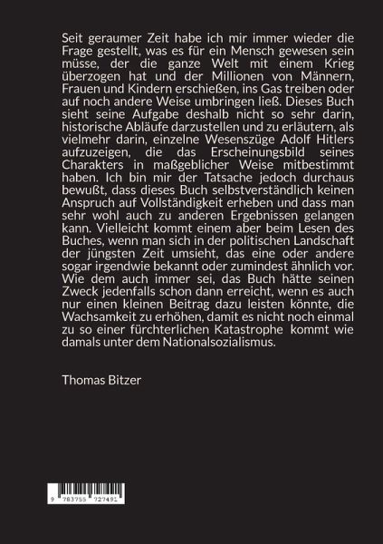 Thomas Bitzer, geboren 1944 in Königsberg, Jurist. Neben seiner beruflichen Tätigkeit hat er sich schon immer auch für geschichtliche Themen interessiert, und das Buch ist gewissermaßen das Ergebnis dessen, was er im Laufe der Zeit über die Charaktereigenschaften Adolf Hitlers gelesen oder in Vorlesungen gehört hat.