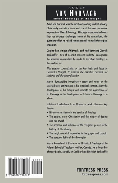 Adolf von Harnack was the most outstanding student of early Christianityin modern times and one of the most persuasive exponents of liberaltheology. Although subsequent scholarship has strongly challenged manyof his conclusions, the questions he raised remain central to muchtheological endeavor. Despite their critique of Harnack, both Karl Barth and DietrichBonhoeffer - two of his most eminent students - recognized the immensecontribution he made to Christian theology in the modern era. This volume concentrates on the key texts and ideas in Harnack'sthought. It presents the essential Harnack for students and the generalreader. Martin Rumscheidt's introductory essay and notes on the selected textsset Harnack in his historical context, chart the development of histhought, and indicate the significance of his theology in thedevelopment of Christian theology as a whole. Substantial selections from Harnack's work illustrate key themes: History as a science in the service of theology The gospel, early Christianity, and the history of dogma and thechurch The presence and influence of the 'religious genius' in the history ofChristianity The religious-social imperative in the gospel and church The personal faith of the theologian