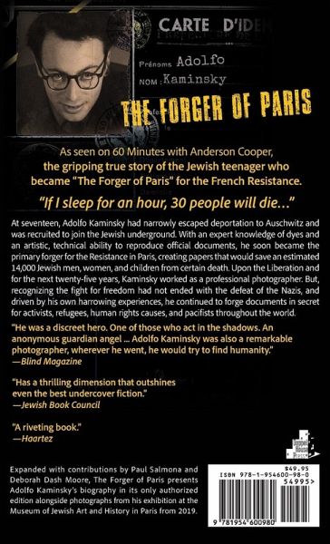 As seen on 60 Minutes with Anderson Cooper and in the Emmy-award-winning New York Times documentary, the gripping true story of a Jewish teenager who became "The Forger of Paris" for the French Resistance. The Forger of Paris presents Adolfo Kaminsky’s biography in its only authorized edition, expanded with photographs from Kaminsky's 2019 exhibition at the Museum of Jewish Art and History in Paris and accompanied by essays from MAHJ director Paul Salmona and National Jewish Book Award winner Deborah Dash Moore. "This necessary book provides unforgettable insights into hidden worlds of the Jews, intellectuals, and partisans who fought back.... has a thriller dimension that outshines even the best undercover fiction." —Jewish Book Council At seventeen, Adolfo Kaminsky had narrowly escaped deportation to Auschwitz and was recruited to join the Jewish underground. Due to his expert knowledge of dyes and an artistic, technical ability to reproduce official documents, he soon became the primary forger for the Resistance in Paris, creating papers that would save an estimated 14,000 Jewish men, women, and children from certain death. Upon the Liberation and for the next twenty-five years, Kaminsky worked as a professional photographer. But, recognizing the fight for freedom had not ended with the defeat of the Nazis, and driven by his own harrowing experiences, he continued to forge documents in secret for activists, refugees, human rights causes, and pacifists throughout the world. "At a moment when someone’s passport, or religion, can still mean the difference between life and death, Mr. Kaminsky’s story remains painfully relevant, but inspiring." —Filmmakers Samantha Stark, Alexandra Garcia and Pamela Druckerman for The New York Times "A triumphant wartime biography, full of heroism and near-alchemistic craftiness." —Foreword Reviews