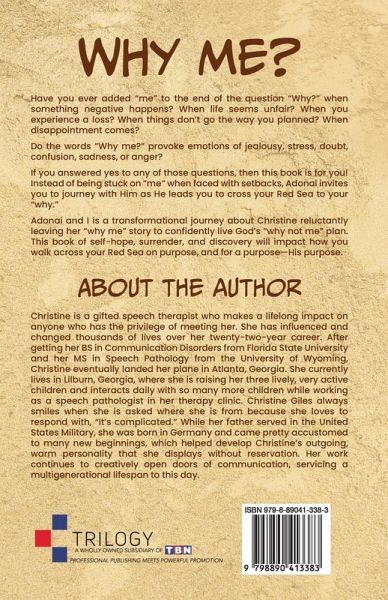 WHY ME? Have you ever added "me" to the end of the question "Why?" when something negative happens? When life seems unfair? When you experience a loss? When things don't go the way you planned? When disappointment comes? Do the words "Why me?" provoke emotions of jealousy, stress, doubt, confusion, sadness, or anger? If you answered yes to any of those questions, then this book is for you! Instead of being stuck on "me" when faced with setbacks, Adonai invites you to journey with Him as He leads you to cross your Read Sea to your "why." Adonai and I is a transformational journey about Christine reluctantly leaving her "why me" story to confidently live God's "why not me" plan. This book of self-hope, surrender, and discovery will impact how you walk across your Read Sea on purpose, and for a purpose = His purpose.