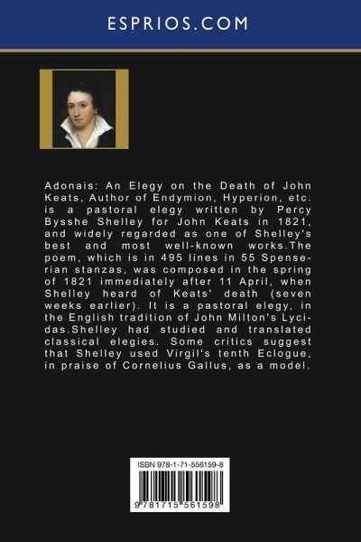 Adonais: An Elegy on the Death of John Keats, Author of Endymion, Hyperion, etc. is a pastoral elegy written by Percy Bysshe Shelley for John Keats in 1821, and widely regarded as one of Shelley's best and most well-known works. The poem, which is in 495 lines in 55 Spenserian stanzas, was composed in the spring of 1821 immediately after 11 April, when Shelley heard of Keats' death (seven weeks earlier). It is a pastoral elegy, in the English tradition of John Milton's Lycidas. Shelley had studied and translated classical elegies. Some critics suggest that Shelley used Virgil's tenth Eclogue, in praise of Cornelius Gallus, as a model.