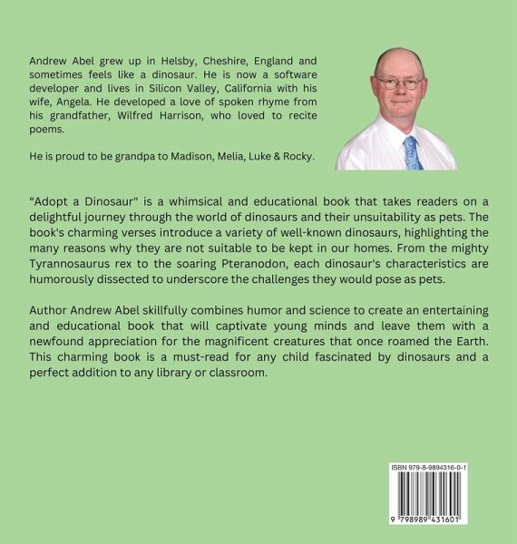 "Adopt a Dinosaur" is a whimsical and educational book that takes readers on a delightful journey through the world of dinosaurs and their unsuitability as pets. The book's charming verses introduce a variety of well-known dinosaurs, highlighting the many reasons why they are not suitable to be kept in our homes. From the mighty Tyrannosaurus rex to the soaring Pteranodon, each dinosaur's characteristics are humorously dissected to underscore the challenges they would pose as pets. Author Andrew Abel skillfully combines humor and science to create an entertaining and educational book that will captivate young minds and leave them with a newfound appreciation for the magnificent creatures that once roamed the Earth. This charming book is a must-read for any child fascinated by dinosaurs and a perfect addition to any library or classroom.