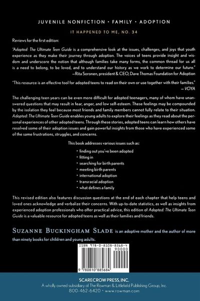 The challenging teen years can be even more difficult for adopted teens, many of whom have unanswered questions that may result in fear, anger, and low self-esteem. Adopted: The Ultimate Teen Guide enables young adults to read about the personal experiences of other adopted teens, and gain powerful insights from those who have gone through some of their same frustrations, struggles, and concerns. This revised edition features discussion questions at the end of each chapter that help teens address various concerns, such as fitting in, deciding whether or not to search for their birth parents, meeting their birth parents, and what defines a family.