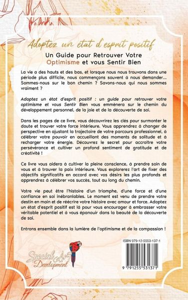 La vie est un voyage plein de rebondissements, et nous avons parfois l'impression de naviguer dans un labyrinthe d'incertitudes. Adoptez un état d'esprit positif : un guide de la pensée positive pour les femmes est destiné à vous guider dans ce voyage de découverte de soi, vers une vie pleine de joie et de satisfaction. Au fil des pages de ce livre de développement personnel, vous découvrirez les clés qui vous permettront de surmonter le doute et de retrouver votre force intérieure. Ce voyage de transformation implique, non seulement, d'ajuster la trajectoire de votre parcours professionnel, mais aussi de célébrer le pouvoir que procurent les moments de solitude et de cultiver votre propre bien-être. Découvrez le secret pour accroître votre persévérance et cultiver un sens profond de la gratitude et de la créativité ! Grâce au pouvoir de la pleine conscience et du soin de soi, vous trouverez un havre de paix intérieure et d'équilibre. Ensemble, nous découvrirons l'art de créer des objectifs significatifs qui correspondent à vos désirs les plus importants et nous apprendrons à savourer la joie de célébrer les résultats. L'histoire de notre vie est une trame et une toile de triomphe, de résilience et de confiance en soi inébranlable. Le moment est venu de prendre les rênes de votre destin en main et de réécrire votre histoire avec amour. L'adoption d'un état d'esprit positif, faisant de lui votre fidèle compagnon, va vous encourager à embrasser pleinement votre potentiel illimité et à vous épanouir dans la beauté de la découverte de soi.