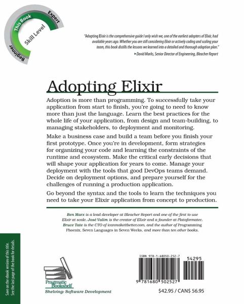 Adoption is more than programming. Elixir is an exciting new language, but to successfully get your application from start to finish, you're going to need to know more than just the language. The case studies and strategies in this book will get you there. Learn the best practices for the whole life of your application, from design and team-building, to managing stakeholders, to deployment and monitoring. Go beyond the syntax and the tools to learn the techniques you need to develop your Elixir application from concept to production. Learn real-life strategies from the people who built Elixir and use it successfully at scale. See how Ben Marx and Bleacher Report maintain one of the highest-traffic Elixir applications by selling the concept to management and delivering on that promise. Find out how Bruce Tate and icanmakeitbetter hire and train Elixir engineers, and the techniques they've employed to design and ensure code consistency since Elixir's early days. Explore customer challenges in deploying and monitoring distributed applications with Elixir creator Jose Valim and Plataformatec. Make a business case and build a team before you finish your first prototype. Once you're in development, form strategies for organizing your code and learning the constraints of the runtime and ecosystem. Convince stakeholders, both business and technical, about the value they can expect. Prepare to make the critical early decisions that will shape your application for years to come. Manage your deployment with all of the knobs and gauges that good DevOps teams demand. Decide between the many options available for deployment, and how to best prepare yourself for the challenges of running a production application. This book picks up where most Elixir books leave off. It won't teach you to program Elixir, or any of its tools. Instead, it guides you through the broader landscape and shows you a holistic approach to adopting the language. What You Need: This book works with any version of Elixir.