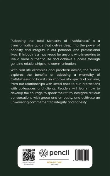 ""Adopting the Total Mentality of Truthfulness"" is a transformative guide that delves deep into the power of honesty and integrity in our personal and professional lives. This book is a must-read for anyone who is seeking to live a more authentic life and achieve success through genuine relationships and communication. With real-life examples and practical advice, the author explores the benefits of adopting a mentality of truthfulness and how it can improve all aspects of our lives, from our relationships with loved ones to our interactions with colleagues and clients. Readers will learn how to develop the courage to speak their truth, navigate difficult conversations with grace and empathy, and cultivate an unwavering commitment to integrity and honesty.