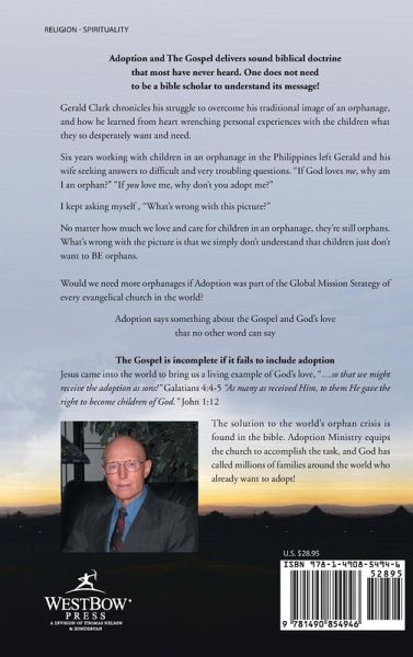 Adoption and The Gospel delivers sound biblical doctrine that most have never heard. One does not need to be a bible scholar to understand its message! Gerald Clark chronicles his struggle to overcome his traditional image of an orphanage, and how he learned from heart wrenching personal experiences with the children what they so desperately want and need. Six years working with children in an orphanage in the Philippines left Gerald and his wife seeking answers to difficult and very troubling questions. "If God loves me, why am I an orphan?" "If you love me, why don't you adopt me?" I kept asking myself , "What's wrong with this picture?" No matter how much we love and care for children in an orphanage, they're still orphans. What's wrong with the picture is that we simply don't understand that children just don't want to BE orphans. Would we need more orphanages if Adoption was part of the Global Mission Strategy of every evangelical church in the world? Adoption says something about the Gospel and God's love that no other word can say The Gospel is incomplete if it fails to include adoption Jesus came into the world to bring us a living example of God's love, "…so that we might receive the adoption as sons!" Galatians 4:4-5 "As many as received Him, to them He gave the right to become children of God." John 1:12 The solution to the world's orphan crisis is found in the bible. Adoption Ministry equips the church to accomplish the task, and God has called millions of families around the world who already want to adopt!