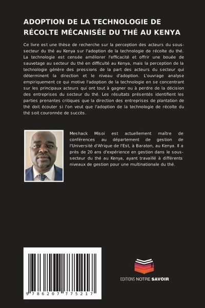 Ce livre est une thèse de recherche sur la perception des acteurs du sous-secteur du thé au Kenya sur l'adoption de la technologie de récolte du thé. La technologie est censée améliorer l'efficacité et offrir une bouée de sauvetage au secteur du thé en difficulté au Kenya, mais la perception de la technologie génère des pressions de la part des acteurs du secteur qui déterminent la direction et le niveau d'adoption. L'ouvrage analyse empiriquement ce qui motive l'adoption de la technologie en se concentrant sur les principaux acteurs qui ont tout à gagner ou à perdre de la décision des entreprises du secteur du thé. Les résultats présentés identifient les parties prenantes critiques que la direction des entreprises de plantation de thé doit écouter si l'on veut que l'adoption de la technologie de récolte du thé soit couronnée de succès.