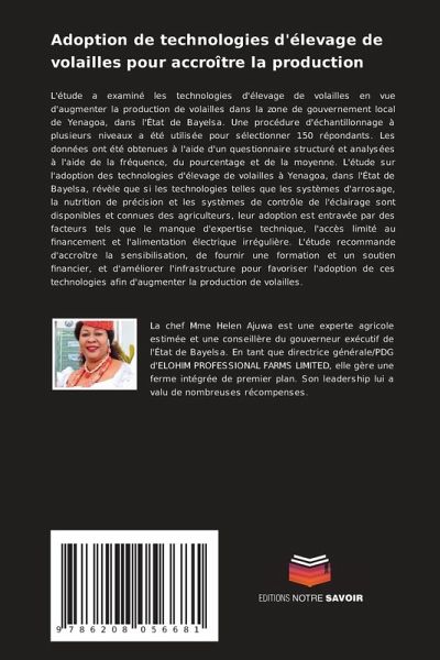 L'étude a examiné les technologies d'élevage de volailles en vue d'augmenter la production de volailles dans la zone de gouvernement local de Yenagoa, dans l'État de Bayelsa. Une procédure d'échantillonnage à plusieurs niveaux a été utilisée pour sélectionner 150 répondants. Les données ont été obtenues à l'aide d'un questionnaire structuré et analysées à l'aide de la fréquence, du pourcentage et de la moyenne. L'étude sur l'adoption des technologies d'élevage de volailles à Yenagoa, dans l'État de Bayelsa, révèle que si les technologies telles que les systèmes d'arrosage, la nutrition de précision et les systèmes de contrôle de l'éclairage sont disponibles et connues des agriculteurs, leur adoption est entravée par des facteurs tels que le manque d'expertise technique, l'accès limité au financement et l'alimentation électrique irrégulière. L'étude recommande d'accroître la sensibilisation, de fournir une formation et un soutien financier, et d'améliorer l'infrastructure pour favoriser l'adoption de ces technologies afin d'augmenter la production de volailles.