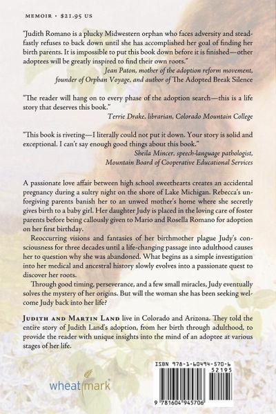 A passionate love affair between high school sweethearts creates an accidental pregnancy during a sultry night on the shore of Lake Michigan. Rebecca's unforgiving parents banish her to an unwed mother's home where she secretly gives birth to a baby girl. Her daughter Judy is placed in the loving care of foster parents before being callously given to Mario and Rosella Romano for adoption on her first birthday. Reoccurring visions and fantasies of her birthmother plague Judy's consciousness for three decades until a life-changing passage into adulthood causes her to question why she was abandoned. What begins as a simple investigation into her medical and ancestral history slowly evolves into a passionate quest to discover her roots. Through good timing, perseverance, and a few small miracles, Judy eventually solves the mystery of her origins. But will the woman she has been seeking welcome Judy back into her life? About the Authors Judith and Martin Land live in Colorado and Arizona. They told the entire story of Judith Land's adoption, from her birth through adulthood, to provide the reader with unique insights into the mind of an adoptee at various stages of her life.