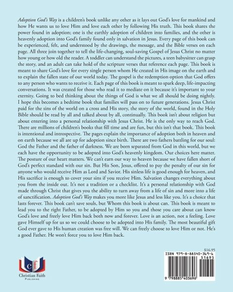 Adoption God's Way is a children's book unlike any other as it lays out God's love for mankind and how He wants us to love Him and love each other by following His truth. This book shares the power found in adoption; one is the earthly adoption of children into families, and the other is heavenly adoption into God's family found only in salvation in Jesus. Every page of this book can be experienced, felt, and understood by the drawings, the message, and the Bible verses on each page. All three join together to tell the life-changing, soul-saving Gospel of Jesus Christ no matter how young or how old the reader. A toddler can understand the pictures, a teen babysitter can grasp the story, and an adult can take hold of the scripture verses that reference each page. This book is meant to share God's love for every single person whom He created in His image on the earth and to explain the fallen state of our world today. The gospel is the redemption option that God offers to any person who wants to receive it. Each page of this book is meant to spark deep, life-impacting conversations. It was created for those who read it to mediate on it because it's important to your eternity. Going to bed thinking about the things of God is what we all should be doing nightly. I hope this becomes a bedtime book that families will pass on to future generations. Jesus Christ paid for the sins of the world on a cross and His story, the story of the world, found in the Holy Bible should be read by all and talked about by all, continually. This book isn't about religion but about entering into a personal relationship with Jesus Christ. He is the only way to reach God. There are millions of children's books that fill time and are fun, but this isn't that book. This book is intentional and introspective. The pages explain the importance of adoption both in heaven and on earth because we all are up for adoption since birth. There are two fathers battling for our soul: God the Father and the father of darkness. We are born separated from God in this world, but we each have the opportunity to be adopted into God's heavenly kingdom. Our choices here matter. The posture of our heart matters. We can't earn our way to heaven because we have fallen short of God's perfect standard with our sin. But His Son, Jesus, offered to pay the penalty of our sin for anyone who would receive Him as Lord and Savior. His sinless life is good enough for heaven, and His sacrifice is enough to cover your sins if you receive Him. Salvation changes everything about you from the inside out. It's not a tradition or a checklist. It's a personal relationship with God made through Christ that gives you the ability to turn away from a life of sin and more into a life of sanctification. Adoption God's Way makes you more like Jesus and less like you. It's a choice that lasts forever. This book can't save souls, but Whom this book is about can. This book is meant to lead you to the right Father, to be adopted by Him so you and those you care about can know God's love and freely love Him back both now and forever. Love is an action, not a feeling. Love gave Himself up for us so we could choose to be adopted into His family. The most beautiful gift God ever gave to His human creation was free will. We can freely choose to love Him or not. He's a good Father. He won't force you to love Him back.