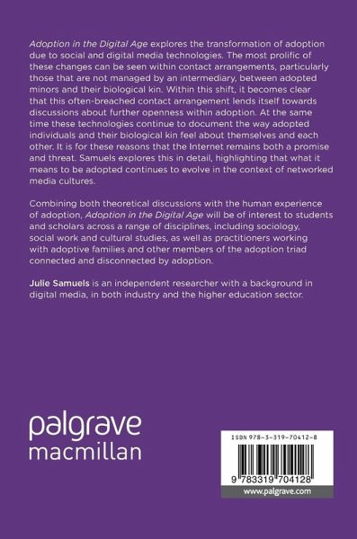 Adoption in the Digital Age explores the transformation of adoption due to social and digital media technologies. The most prolific of these changes can be seen within contact arrangements, particularly those that are not managed by an intermediary, between adopted minors and their biological kin. Within this shift, it becomes clear that this often-breached contact arrangement lends itself towards discussions about further openness within adoption. At the same time these technologies continue to document the way adopted individuals and their biological kin feel about themselves and each other. It is for these reasons that the Internet remains both a promise and threat. Samuels explores this in detail, highlighting that what it means to be adopted continues to evolve in the context of networked media cultures.
