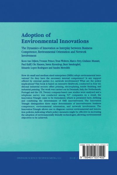 How do small and medium sized enterprises (SMEs) adopt environmental innovations? Do they have the necessary internal competence? Is any support offered by external parties (i.e. network involvement)? What are the policy implications? This book is based on extensive fieldwork, conducted in four traditional industrial sectors: offset printing, electroplating, textile finishing, and industrial painting. The work was carried out in Denmark, Italy, the Netherlands, Portugal and the UK. Twenty company-based case studies were analyzed and a telephone survey was conducted among 527 companies. As a result, the Innovation Triangle came to be formulated, which is presented here, defining and combining the determinants of SME innovativeness. The Innovation Triangle distinguishes three major determinants of innovativeness: business competence, environmental orientation, and network involvement. The Innovation Triangle allows one to diagnose current environmental and innovation policies, indicating which policy measures might be effective in increasing the adoption of environmentally friendly technologies, allowing environmental objectives to be achieved.