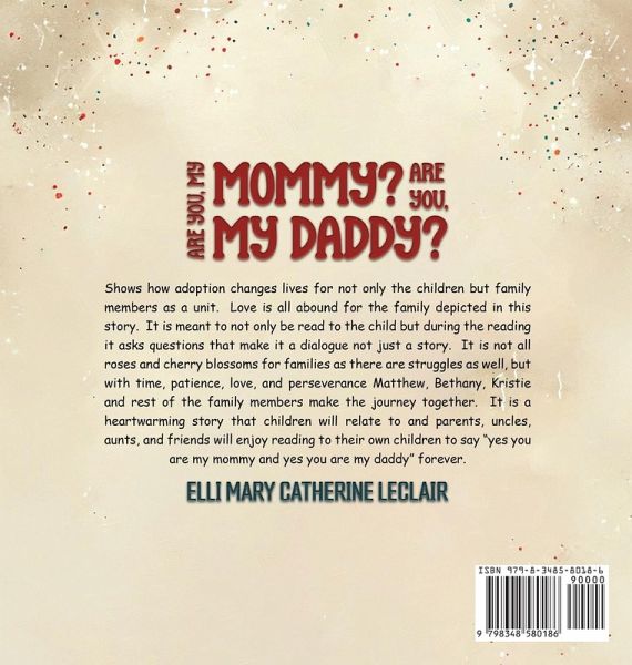 Shows how adoption changes lives for not only the children but family members as a unit. Love is all abound for the family depicted in this story. It is meant to not only be read to the child but during the reading it asks questions that make it a dialogue not just a story. It is not all roses and cherry blossoms for families as there are struggles as well, but with time, patience, love, and perseverance Matthew, Bethany, Kristie and rest of the family members make the journey together. It is a heartwarming story that children will relate to and parents, uncles, aunts, and friends will enjoy reading to their own children to say "yes you are my mommy and yes you are my daddy" forever.