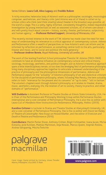 'The recently revived interest in the work of T.W. Adorno has made clear the need for new ways of understanding his relevance to a critical appraisal of contemporary culture. Adorno and Performance offers a wealth of perspectives on how Adorno's work can inform and be informed by reflection on performance, as something central both to the arts, particularly theatre and music, and to social and political life more generally.' - Professor Andrew Bowie, Royal Holloway, University of London, UK