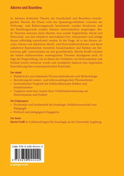 In Adornos Kritischer Theorie der Gesellschaft und Bourdieus Soziologischer Theorie der Praxis wird das Spannungsverhältnis zwischen der Wirkungs- und Beharrungsmacht bestehender sozialer Strukturen und der Handlungsmacht sozialer Akteure unterschiedlich ausgetragen. Beide Theorien stimmen darin überein, dass soziale Ungleichheit, Macht und Herrschaft, von den Subjekten internalisiert bzw. inkorporiert und infolge dessen selbsttätig reproduziert werden. In der Frage, ob es aus diesem circulus vitiosus von objektiven Macht- und Herrschaftsstrukturen und deren subjektiver Reproduktion vermittels Sozialcharakter und Habitus ein Entkommen gibt, unterscheiden sie sich grundsätzlich. Martin Proißl zeichnet die beiden einflussreichen soziologischen Theorien detailgenau nach. Er folgt der Fragestellung, wie in ihnen das Verhältnis von Determination und Freiheit jeweils bestimmt wurde und ermöglicht dadurch eine begründete Einschätzung ihres emanzipatorischen Potenzials.
