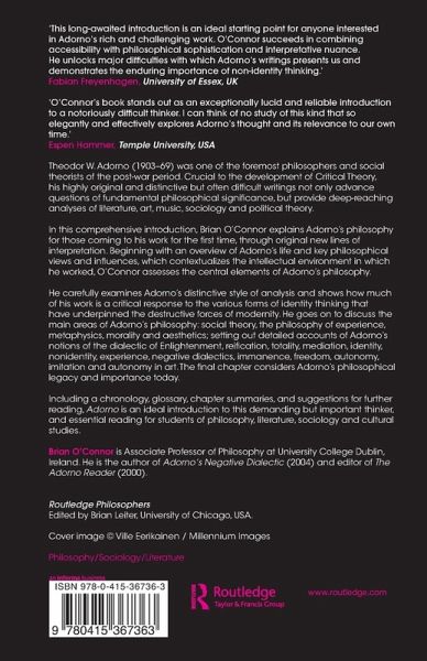 In this comprehensive introduction, Brian O'Connor explains Adorno's philosophy for those coming to his work for the first time, through original new lines of interpretation. Beginning with an overview of Adorno's life and key philosophical views and influences, which contextualizes the intellectual environment in which he worked, O'Connor assesses the central elements of Adorno's philosophy.