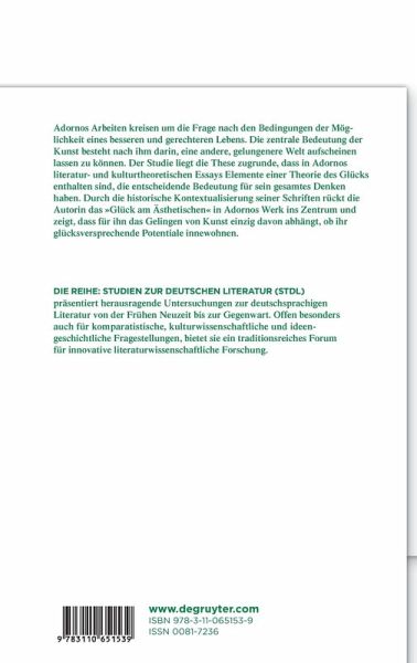 Adornos Arbeiten kreisen beständig um die Frage nach den Bedingungen der Möglichkeit eines besseren und gerechteren Lebens. Nimmt man das Glück als Ausgangspunkt von Adornos Denken ernst, so kommt der Kunst die Bedeutung zu, eine andere, gelungenere Welt aufscheinen zu lassen. Ausgehend von dieser Beobachtung untersucht die Autorin, wie Kunstwerke nach Adorno beschaffen sein müssen, um ein Glücksversprechen artikulieren zu können. Sie verbindet diese Frage der Produktion von Kunst mit einer rezeptionsästhetischen Perspektive, die das Glück der ästhetischen Erfahrung selbst in den Blick nimmt. Gerade in Adornos literatur- und kulturtheoretischen Essays, u.a. zu Beckett, Kafka, Hölderlin, Helms und Goethe, aber auch zur Heiterkeit der Kunst und zum Kitsch, finden sich Elemente einer Theorie des Glücks, so ihre These, die entscheidende Bedeutung für Adornos gesamtes Denken haben. Durch die historische Kontextualisierung seiner Essays rückt Groß das "Glück am Ästhetischen" in Adornos Werk ins Zentrum und zeigt, dass für ihn das Gelingen von Kunst einzig davon abhängt, ob ihr glücksversprechende Potentiale innewohnen.