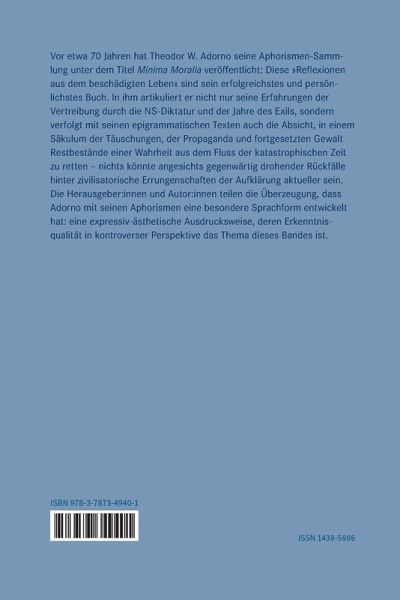 Vor etwa 70 Jahren hat Theodor W. Adorno seine Aphorismen-Sammlung unter dem Titel »Minima Moralia« veröffentlicht: Diese »Reflexionen aus dem beschädigten Leben« sind sein erfolgreichstes und persönlichstes Buch. In ihm artikuliert er nicht nur seine Erfahrungen der Vertreibung durch die NS-Diktatur und der Jahre des Exils, sondern verfolgt mit seinen epigrammatischen Texten auch die Absicht, in einem Säkulum der Täuschungen, der Propaganda und fortgesetzten Gewalt Restbestände einer Wahrheit aus dem Fluss der katastrophischen Zeit zu retten ¿ nichts könnte angesichts gegenwärtig drohender Rückfälle hinter zivilisatorische Errungenschaften der Aufklärung aktueller sein. Die Herausgeber:innen und Autor:innen ¿ darunter Anne Eusterschulte, Petra Gehring, Josef Früchtl, Viet Anh Hguyen Duc, Martin Mittelmeier, Ralf Konersmann, Stefan Niklas, Detlev Schöttker, Martin Seel, Johann Kreuzer, Ferdinand Zehntreiter ¿ teilen die Überzeugung, dass Adorno mit seinen Aphorismen eine besondere Sprachform entwickelt hat: eine expressiv-ästhetische Ausdrucksweise, deren Erkenntnisqualität in kontroverser Perspektive das Thema dieses Bandes ist.