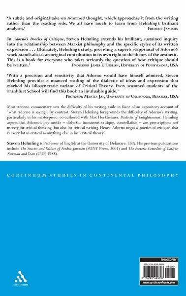 Adorno's Poetics of Critique is a critical study of the Marxist culture-critic Theodor W. Adorno, a founding member of the Frankfurt school and widely regarded today as its most brilliant exponent. Steven Helmling is centrally concerned with Adorno's notoriously difficult writing, a feature most commentators acknowledge only to set it aside on the way to an expository account of 'what Adorno is saying'. By contrast, Adorno's complex writing is the central focus of this study, which includes detailed analysis of Adorno's most complex texts, in particular his most famous and complicated work, co-authored with Max Horkheimer, Dialectic of Enlightenment. Helmling argues that Adorno's key motifs - dialectic, concept, negation, immanent critique, constellation - are prescriptions not merely for critical thinking, but also for critical writing. For Adorno the efficacy of critique is conditioned on how the writing of critique is written. Both in theory and in practice, Adorno urges a 'poetics of critique' that is every bit as critical as anything else in his 'critical theory.