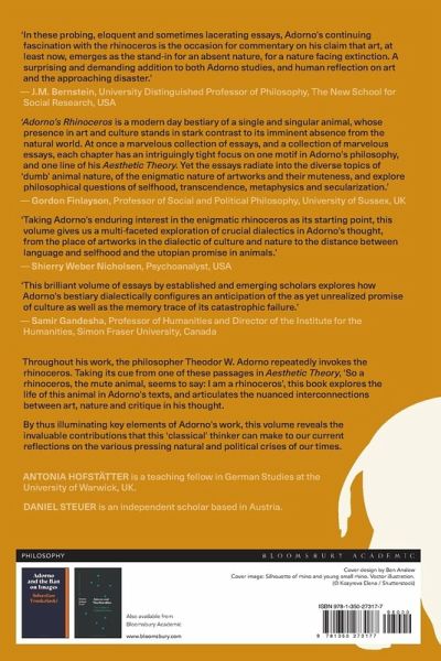 Acknowledgments List of Illustrations List of Contributors 1. Introduction: The enigma of the rhinoceros Antonia Hofstätter ( University of Warwick UK) 2. In the name of the rhinoceros: expression beyond human intention Camilla Flodin (Uppsala University Sweden) 3. The rhinoceros at the bottom of the sea: Adorno Dürer and the silent eloquence of artworks Antonia Hofstätter (University of Warwick UK) 4. Just one line: reading T. W. Adorno on humans artworks and animals Lydia Goehr (Columbia University USA) 5. The mute animal Alexander García Düttmann (Universität der Künste Berlin Germany) 6. The speaking animal: on a metaphor of humanity Sebastian Tränkle (Freie Universität Germany) 7. The gaze of the rhinoceros and the 'it' of Aesthetic Theory Daniel Steuer (Independent Scholar Austria) 8. The muted animal Daniel Herwitz (University of Michigan USA) 9. Epilogue: On the actuality of Adorno's rhinoceros - extraction extinction and dignity Daniel Steuer (Independent Scholar Austria) Index