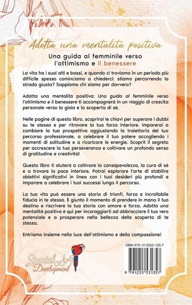La vita è un viaggio pieno di colpi di scena e, a volte, ci può sembrare di navigare in un labirinto di incertezze. Adotta una mentalità positiva: Una guida al femminile verso l'ottimismo e il benessere vuole essere la tua guida in questo percorso di crescita alla scoperta di sé, verso una vita piena di gioia e soddisfazione. Tra le pagine di questo libro di auto-aiuto, potrai scoprire le chiavi per sconfiggere i dubbi su te stessa e ritrovare la tua forza interiore. Questo viaggio di trasformazione prevede non solo l'aggiustamento della traiettoria del tuo percorso professionale, ma anche la celebrazione del potere che deriva dall'abbracciare i momenti di solitudine e dal coltivare il proprio benessere. Scopri il segreto per accrescere la tua perseveranza e coltivare un profondo senso di gratitudine e creatività! Grazie al potere della consapevolezza e della cura di sé, troverai un rifugio di pace interiore ed equilibrio. Insieme scopriremo l'arte di creare obiettivi significativi che siano in linea con i tuoi desideri più importanti e impareremo ad assaporare la gioia di celebrare i risultati. La storia della nostra vita è una tela di trionfi, resilienza e incrollabile fiducia in se stessi. È arrivato il momento di prendere in mano le redini del tuo destino e riscrivi la tua storia con amore. Adotta una mentalità positiva sarà il tuo compagno fedele, che ti incoraggerà ad abbracciare pienamente il tuo potenziale illimitato e a fiorire nella bellezza della scoperta di te stessa.