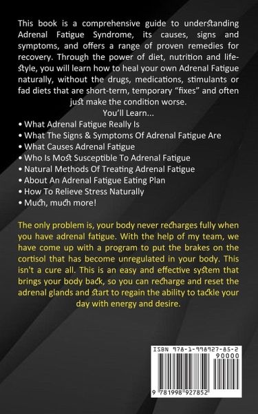 This book is a comprehensive guide to understanding Adrenal Fatigue Syndrome, its causes, signs and symptoms, and offers a range of proven remedies for recovery. Through the power of diet, nutrition and lifestyle, you will learn how to heal your own Adrenal Fatigue naturally, without the drugs, medications, stimulants or fad diets that are short-term, temporary "fixes" and often just make the condition worse. You'll Learn...What Adrenal Fatigue Really Is What The Signs & Symptoms Of Adrenal Fatigue Are What Causes Adrenal Fatigue Who Is Most Susceptible To Adrenal Fatigue Natural Methods Of Treating Adrenal Fatigue About An Adrenal Fatigue Eating Plan How To Relieve Stress Naturally Much, much more! The only problem is, your body never recharges fully when you have adrenal fatigue. With the help of my team, we have come up with a program to put the brakes on the cortisol that has become unregulated in your body. This isn't a cure all. This is an easy and effective system that brings your body back, so you can recharge and reset the adrenal glands and start to regain the ability to tackle your day with energy and desire.