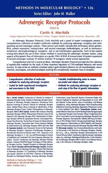 Genetic Analysis.- Construction of Libraries for Isolation of Adrenergic Receptor Genes.- Isolation of Adrenergic Receptor Genes.- Analyses of Adrenergic Receptor Sequences.- Polymerase Chain Reaction Screening of Genomic Libraries for Adrenergic Receptor Genes.- Solution-Phase Library Screening for Identification of Rare Adrenergic Receptor Clones.- Genetic Polymorphisms of Adrenergic Receptors.- RNA Analysis.- Northern Blot Analyses Detecting Adrenergic Receptor mRNAs.- Ribonuclease Protection Assay for the Detection of ?1-Adrenergic Receptor RNA.- Determination of Adrenergic Receptor mRNAs by Quantitative Reverse Transcriptase-Polymerase Chain Reactions.- Nuclear Run-On Assays for Measurement of Adrenergic Receptor Transcription Rate.- Primer Extension Methods for Determination of ?1-Adrenergic Receptor mRNA Start Sites.- Expression Analysis.- Use of Eukaryotic Vectors for the Expression of Adrenergic Receptors.- Expression of ?-Adrenergic Receptors in Recombinant Baculovirus-Infected Insect Cells.- Expression of ?-Adrenergic Receptors in E. coli.- Use and Pharmacological Analysis of Established and Transfected Cell Lines Expressing Adrenergic Receptors.- Transient Transfection and Adrenergic Receptor Promoter Analysis.- Antisense RNA/DNA-Based Techniques to Probe Adrenergic Receptor Function.- Targeted Disruption of Adrenergic Receptor Genes.- Receptor and Second Messenger Analysis.- Development of Antibodies to Adrenergic Receptors.- Western Blot Detection of Adrenergic Receptors.- UV Crosslinking of Adrenergic Receptors and Ligands.- Detection of ?-Adrenergic Receptors by Radioligand Binding.- Assessing Adrenergic Receptor Conformation Using Chemically Reactive Fluorescent Probes.- Biochemical Methods for Detection and Measurement of Cyclic AMP and AdenylylCyclase Activity.- Assay of Arachidonic Acid Release Coupled to ?1- and ?2-Adrenergic Receptors.- Patch-Clamp Recording Methods for Examining Adrenergic Regulation of Potassium Currents in Ocular Epithelial Cells.- Transactivator Analysis.- Southwestern Blots for Detection of a DNA Binding Protein Recognizing the ?1B-Adrenergic Receptor Gene Promoter.- DNase I Footprinting Analysis of Transcription Factors Recognizing Adrenergic Receptor Gene Promoter Sequences.- Electrophoretic Mobility Shift Assay for Detection of DNA Binding Proteins Recognizing ?-Adrenergic Receptor Gene Sequences.- Determination of mRNA Stability and Characterization of Proteins Interacting with Adrenergic Receptor mRNAs.- Microscopy Analysis.- Use of Immunohistochemistry and Confocal Microscopy in the Detection of Adrenergic Receptors.- Distribution of ?2A- and ?2C-Adrenergic Receptor Immunoreactivity in the Central Nervous System.- Quantitative Light Microscopic Autoradiography of ?2-Adrenergic Radioligand Binding Sites.- In Situ Hybridization of Adrenergic Receptor mRNA in Brain.- Use of Electron Microscopy in the Detection of Adrenergic Receptors.