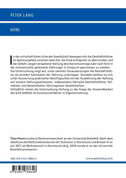 In der wirtschaftlichen Krise der Gesellschaft bewegen sich die Geschäftsführer im Spannungsfeld zwischen dem Ziel, die Krise erfolgreich zu überwinden und der Gefahr, wegen verspäteter Stellung des Insolvenzantrags oder nach Eintritt der Insolvenzreife geleisteter Zahlungen in Anspruch genommen zu werden. Die Untersuchung zeigt auf, unter welchen Voraussetzungen die Geschäftsführer als primäre Adressaten der Haftung unterliegen. Daneben befasst sie sich unter Auswertung praktischer Gesichtspunkte mit der Ausdehnung der Haftung auf weitere Haftungsadressaten, insbesondere faktische Geschäftsführer, Teilnehmer und Gesellschafter führungsloser Gesellschaften. Schließlich nimmt die Untersuchung Stellung zu der Frage der Anwendbarkeit des § 64 GmbHG im Insolvenzverfahren in Eigenverwaltung.