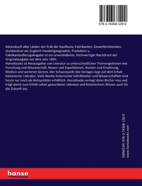 Adressbuch aller Länder der Erde der Kaufleute, Fabrikanten, Gewerbtreibenden, Gutsbesitzer etc Zugleich Handelsgeographie, Produkten u. FabrikantenBezugsAngabe ist ein unveränderter, hochwertiger Nachdruck der Originalausgabe aus dem Jahr 1865.