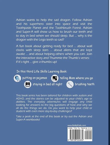 Follow Adrian and his superhero sister on their third everyday adventure! This time it is Rhonda the Rocket who leads the way, as Adrian and Super-A get ready for bed and fly into space to visit the Toothpaste Planet and the Toothbrush Forest. In space they help out some tired aliens who are being kept awake by Ally in her spaceship. These adorable life lessons are based on the social stories technique and are supported by pictograms. It is a fun book about getting ready for bed ... about wall clocks with stars of sleep ... about letting Mom know where you go ... and about lending a helping hand. Adrian and Super-A is an interactive book series tailored for kids with autism and ADHD, but suitable for any curious child. The Adrian and Super-A books and workbooks are available in other languages, and the first book received the "Readers' Favorite" 5-Star Seal.