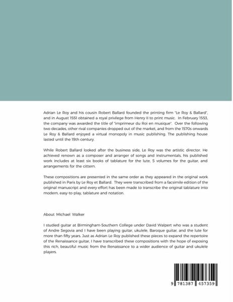 Adrian Le Roy and his cousin Robert Ballard founded the printing firm "Le Roy & Ballard", and in August 1551 obtained a royal privilege from Henry II to print music. In February 1553, the company was awarded the title of "imprimeur du Roi en musique". Over the following two decades, other rival companies dropped out of the market, and from the 1570s onwards Le Roy & Ballard enjoyed a virtual monopoly in music publishing. The publishing house lasted until the 19th century. While Robert Ballard looked after the business side, Le Roy was the artistic director. He achieved renown as a composer and arranger of songs and instrumentals, his published work includes at least six books of tablature for the lute, 5 volumes for the guitar, and arrangements for the cittern. These compositions are presented in the same order as they appeared in the original work published in Paris by Le Roy et Ballard. They were transcribed from a facsimile edition of the original manuscript and every effort has been made to transcribe the original tablature into modern, easy-to-play, tablature and notation.