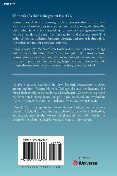 The death of a child is the greatest loss of all. Losing one's child is a non-negotiable experience that can cast one adrift in uncharted waters in a boat without anchor or rudder. Initially, one's mind is kept busy attending to necessary arrangements-but within a few days, the reality of loss sets in-and does not leave. The order of the day suddenly becomes disorder, and seeing it through is the ordeal at hand for emotional survival. Adrift: Poems After the Death of a Child was my attempt to sort things out in poetry after the death of our son John. It is story of loss, heartrending sadness, and somber remembrance of our son; and yet, it is a story in poems that, in the telling, helps me to get through the trial. I hope that my story helps all who suffer the greatest loss of all.