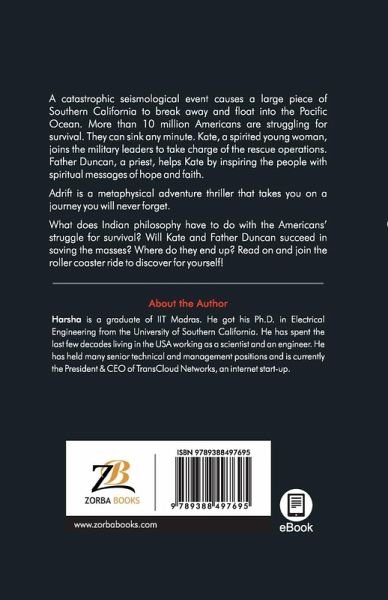 Adrift is a thriller novel. A catastrophic seismological event causes a large piece of Southern California to break away and float into the Pacific Ocean. More than 10 million Americans are struggling for survival. They can sink any minute. Kate, a spirited young woman, joins the military leaders to take charge of the rescue operations. Father Duncan, a priest, helps Kate by inspiring the people with spiritual messages of hope and faith. Adrift is a metaphysical adventure, thriller novel ith the Americans' struggle for survival? Will Kate and Father Duncan succeed in saving the masses? Where do they end up? Read on and join the roller coaster ride to discover for yourself.