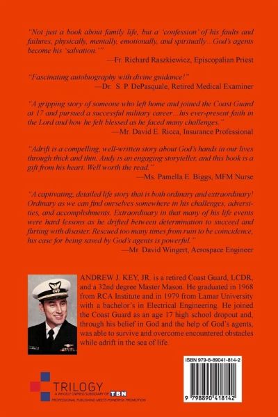 "Not just a book about family life, but a '¿onfession' of his faults and failures, physically, mentally, emotionally, and spiritually...God's agents become his 'salvation.'" -Fr. Richard Raszkiewicz, Episcopalian Priest "Fascinating autobiography with divine guidance!" -Dr. S. P. DePasquale, Retired Medical Examiner "A gripping story of someone who left home and joined the Coast Guard at 17 and pursued a successful military career...his ever-present faith in the Lord and how he felt blessed as he faced many challenges." -Mr. David E. Ricca, Insurance Professional "Adrift is a compelling, well-written story about God's hands in our lives through thick and thin. Andy is an engaging storyteller, and this book is a gift from his heart. Well worth the read." -Ms. Pamella E. Biggs, MFM Nurse "A captivating, detailed life story that is both ordinary and extraordinary! Ordinary as we can find ourselves somewhere in his challenges, adversities, and accomplishments. Extraordinary in that many of his life events were hard lessons as he drifted between determination to succeed and flirting with disaster. Rescued too many times from ruin to be coincidence, his case for being saved by God's agents is powerful." -Mr. David Wingert, Aerospace Engineer