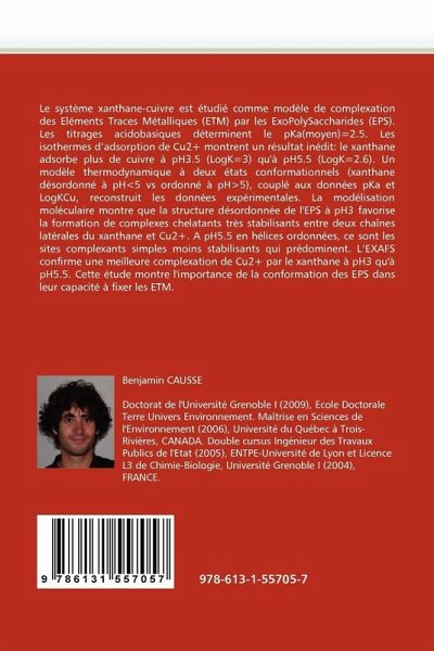 Le système xanthane-cuivre est étudié comme modèle de complexation des Eléments Traces Métalliques (ETM) par les ExoPolySaccharides (EPS). Les titrages acidobasiques déterminent le pKa(moyen)=2.5. Les isothermes d'adsorption de Cu2+ montrent un résultat inédit: le xanthane adsorbe plus de cuivre à pH3.5 (LogK=3) qu'à pH5.5 (LogK=2.6). Un modèle thermodynamique à deux états conformationnels (xanthane désordonné à pH 5), couplé aux données pKa et LogKCu, reconstruit les données expérimentales. La modélisation moléculaire montre que la structure désordonnée de l'EPS à pH3 favorise la formation de complexes chelatants très stabilisants entre deux chaînes latérales du xanthane et Cu2+. A pH5.5 en hélices ordonnées, ce sont les sites complexants simples moins stabilisants qui prédominent. L'EXAFS confirme une meilleure complexation de Cu2+ par le xanthane à pH3 qu'à pH5.5. Cette étude montre l'importance de la conformation des EPS dans leur capacité à fixer les ETM.