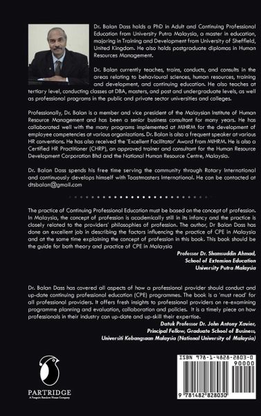 The practice of Continuing Professional Education must be based on the concept of profession. In Malaysia, the concept of profession is academically still in its infancy and the practice is closely related to the providers' philosophies of profession. The author, Dr Balan Dass has done an excellent job in describing the factors influencing the practice of CPE in Malaysia and at the same time explaining the concept of profession in this book. This book should be the guide for both theory and practice of CPE in Malaysia Professor Dr. Shamsuddin Ahmad, School of Extension Education University Putra Malaysia Dr. Balan Dass has covered all aspects of how a professional provider should conduct and up-date continuing professional education (CPE) programmes. The book is a 'must read' for all professional providers. It offers fresh insights to professional providers on re-examining programme planning and evaluation, collaboration and policies. It is a timely piece on how professionals in their industry can up-date and up-skill their expertise. Datuk Professor Dr. John Antony Xavier, Principal Fellow, Graduate School of Business, Universiti Kebangsaan Malaysia (National University of Malaysia)