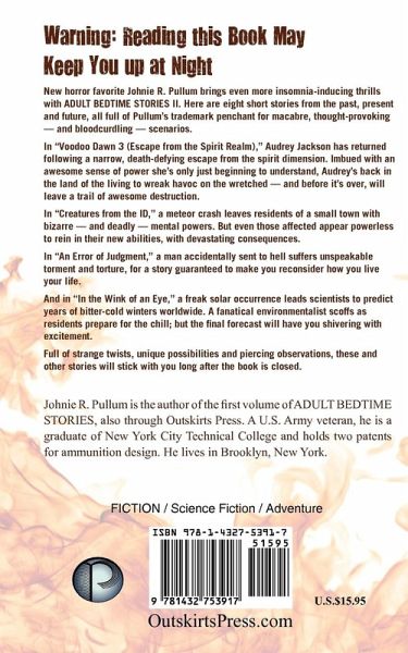 Warning: Reading this Book May Keep You up at Night New horror favorite Johnie R. Pullum brings even more insomnia-inducing thrills with ADULT BEDTIME STORIES II. Here are eight short stories from the past, present and future, all full of Pullum's trademark penchant for macabre, thought-provoking - and bloodcurdling - scenarios.In "Voodoo Dawn 3 (Escape from the Spirit Realm)," Audrey Jackson has returned following a narrow, death-defying escape from the spirit dimension. Imbued with an awesome sense of power she's only just beginning to understand, Audrey's back in the land of the living to wreak havoc on the wretched - and before it's over, will leave a trail of awesome destruction.In "Creatures from the ID," a meteor crash leaves residents of a small town with bizarre - and deadly - mental powers. But even those affected appear powerless to rein in their new abilities, with devastating consequences.In "An Error of Judgment," a man accidentally sent to hell suffers unspeakable torment and torture, for a story guaranteed to make you reconsider how you live your life.And in "In the Wink of an Eye," a freak solar occurrence leads scientists to predict years of bitter-cold winters worldwide. A fanatical environmentalist scoffs as residents prepare for the chill; but the ¿ nal forecast will have you shivering with excitement.Full of strange twists, unique possibilities and piercing observations, these and other stories will stick with you long after the book is closed.