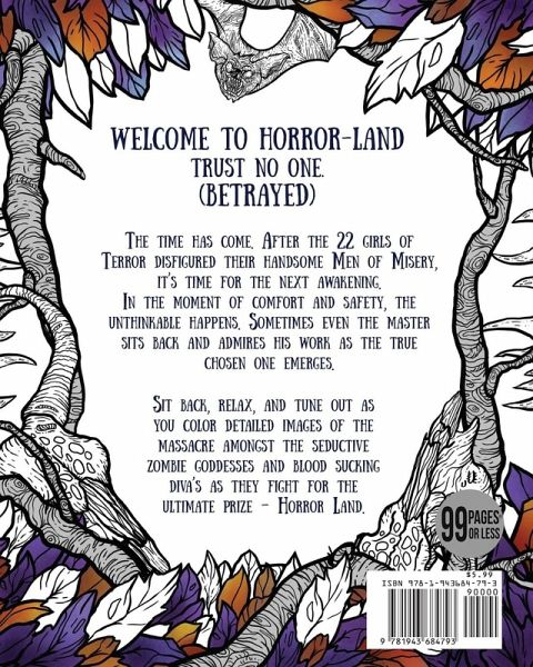The time has come. After the 22 girls of Terror disfigured their handsome Men of Misery, it’s time for the next awakening. In the moment of comfort and safety, the unthinkable happens. Sometimes even the master sits back and admires his work as the true chosen one emerges. Sit back, relax, and tune out as you color detailed images of the massacre amongst the seductive zombie goddesses and blood sucking diva’s as they fight for the ultimate prize––Horror Land.
