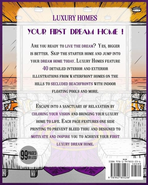 Are you ready to live the dream? Yes, bigger is better. Skip the starter home and jump into your dream home today. Luxury Homes feature 40 detailed interior and exterior illustrations from waterfront homes on the hills to secluded beachfronts with indoor floating pools and more. Escape into a sanctuary of relaxation by coloring your vision and bringing your luxury home to life. Each page features one side printing to prevent bleed thru and designed to motivate and inspire you to achieve your first luxury dream home.