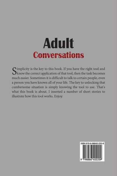 Have you ever been in a conversation that went sideways on you and you didn't know why. Sure you have, we all have, and it doesn't matter whether it was with your spouse, children, friends, client, boss or employee. You found yourself at a loss because you didn't know what caused the sudden shift in direction. That is what this book is about. "Adult conversations" will give you the tools to redirect the conversation where it belongs or signal you that it is time to shut it down. My hope is that through my stories, this tool or concept can be passed on and applied in your daily life. Nothing comes easily. Using this communication tool takes time and patience. Simplicity is the key to this book. If you have the right tool and know the correct application of that tool, then the task becomes much easier. Sometimes it is difficult to talk to certain people, even a person you have known all of your life. The key to unlocking that cumbersome situation is simply knowing the tool to use. That's what this book is about. I inserted a number of short stories to illustrate how this tool works. Enjoy.