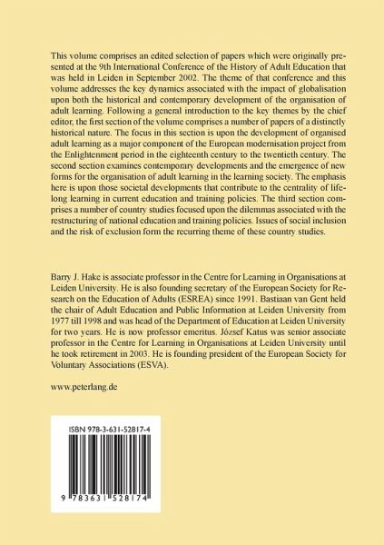 This volume comprises an edited selection of papers which were originally presented at the 9 th International Conference of the History of Adult Education that was held in Leiden in September 2002. The theme of that conference and this volume addresses the key dynamics associated with the impact of globalisation upon both the historical and contemporary development of the organisation of adult learning. Following a general introduction to the key themes by the chief editor, the first section of the volume comprises a number of papers of a distinctly historical nature. The focus in this section is upon the development of organised adult learning as a major component of the European modernisation project from the Enlightenment period in the eighteenth century to the twentieth century. The second section examines contemporary developments and the emergence of new forms for the organisation of adult learning in the learning society. The emphasis here is upon those societal developments that contribute to the centrality of lifelong learning in current education and training policies. The third section comprises a number of country studies focused upon the dilemmas associated with the restructuring of national education and training policies. Issues of social inclusion and the risk of exclusion form the recurring theme of these country studies.